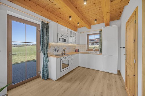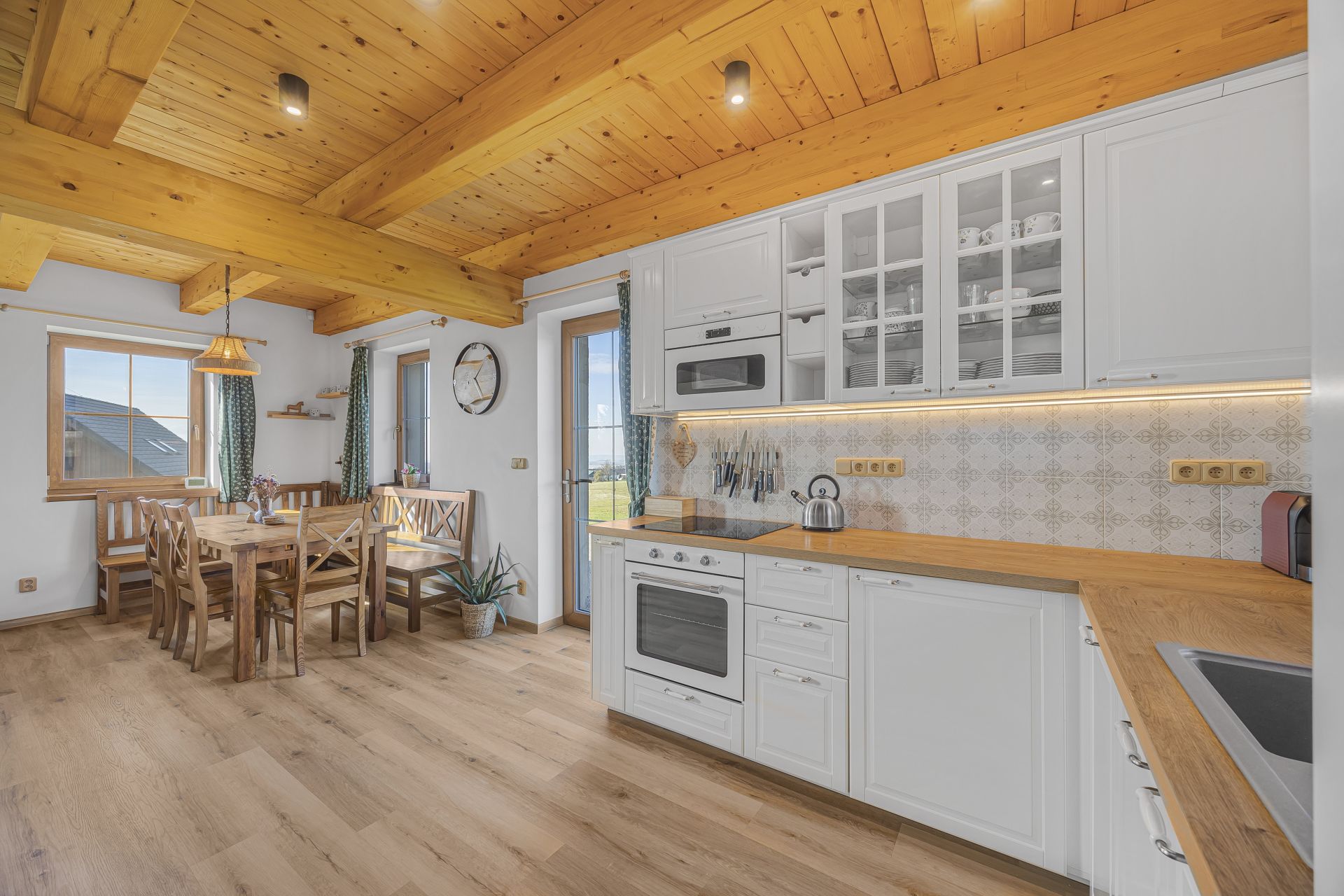 Nemovitost je vybavena moderní kuchyňskou linkou se všemi potřebnými spotřebiči, což ocení každý milovník vaření. Technická místnost je vybavena akumulační nádrží, elektrickým bojlerem a úpravnou pitné vody. Voda je zajištěna z vrtné studny a odpadní vody jsou řešeny biologickou čistírnou, což zaručuje ekologické a efektivní hospodaření s vodními zdroji.