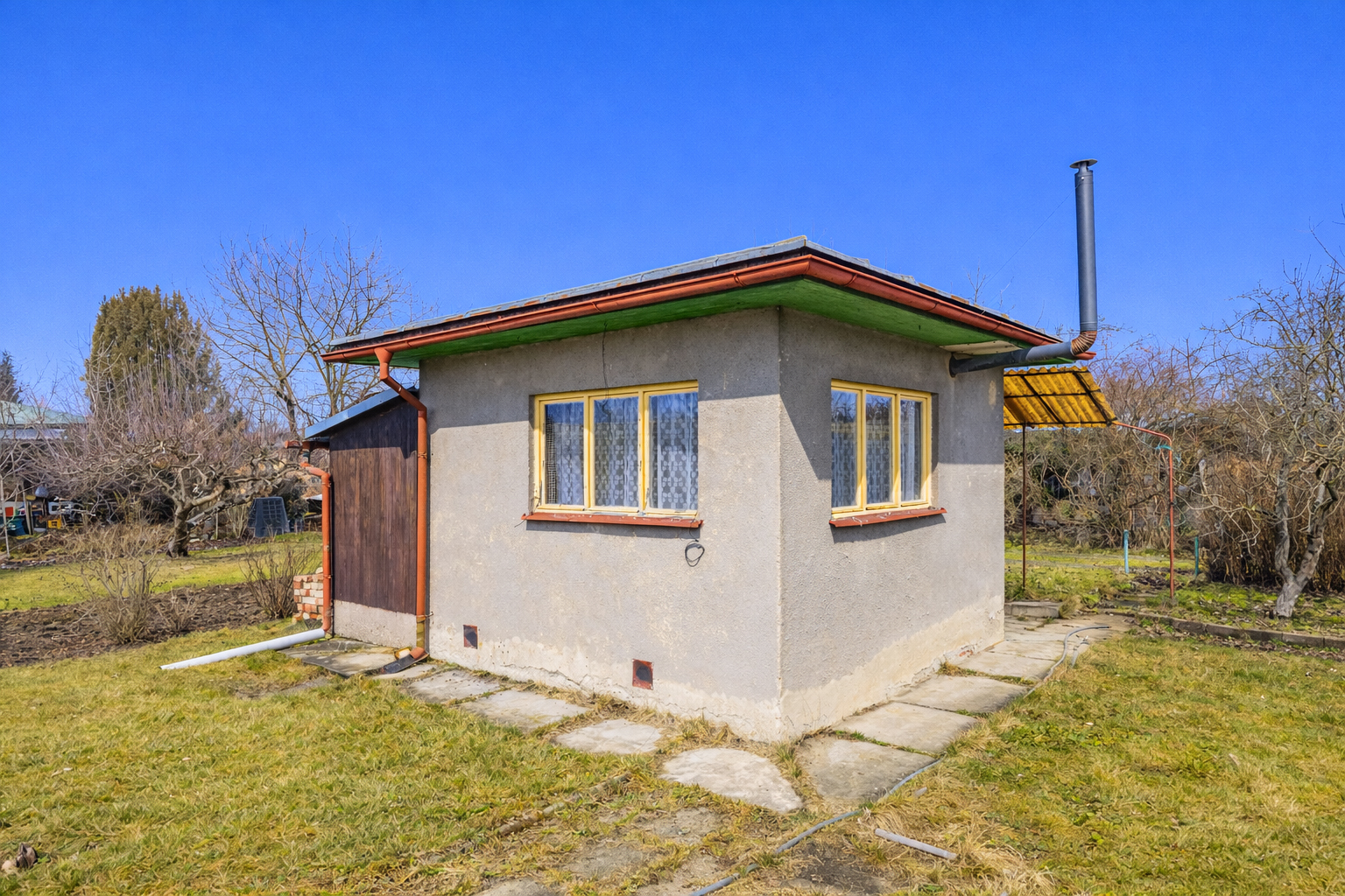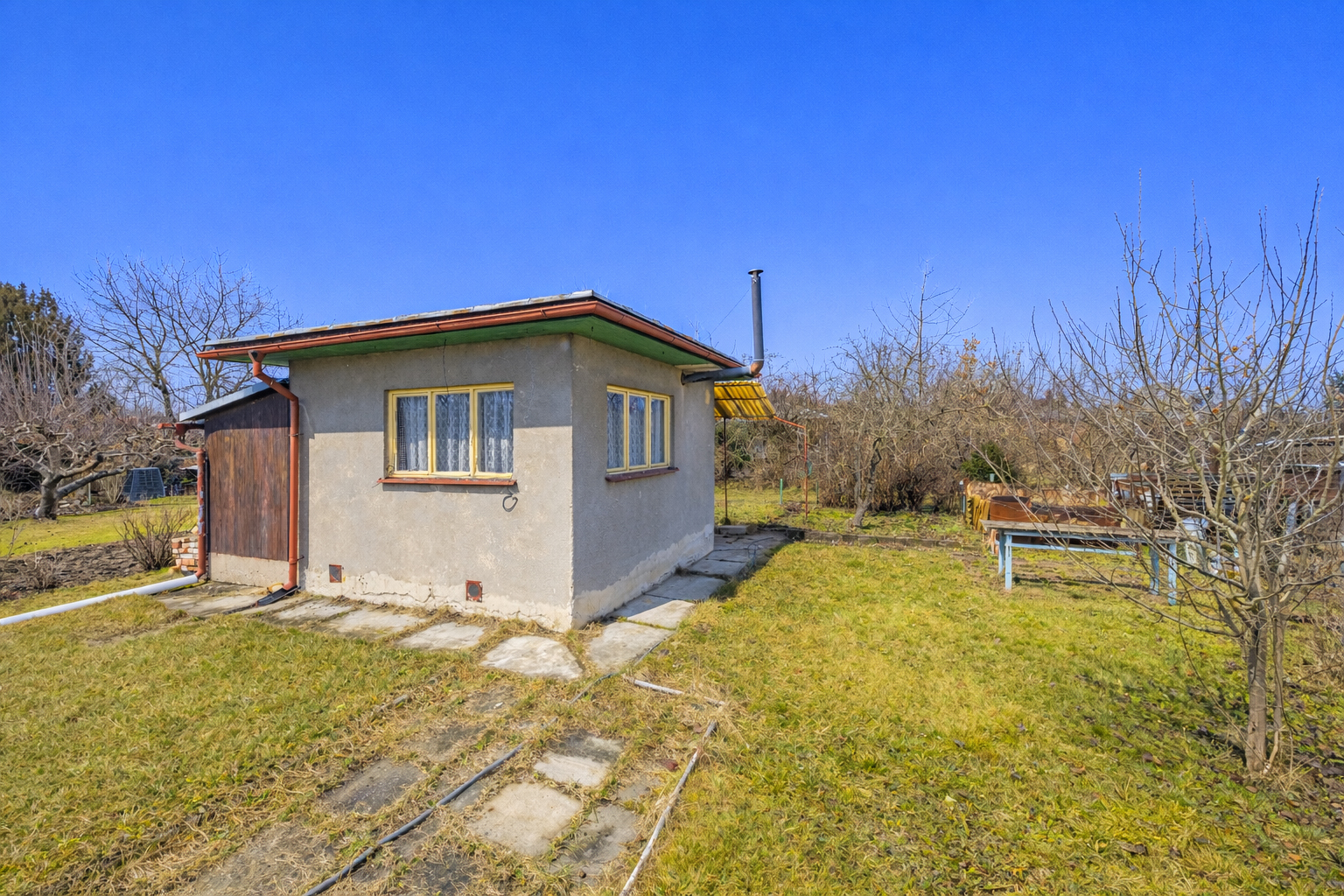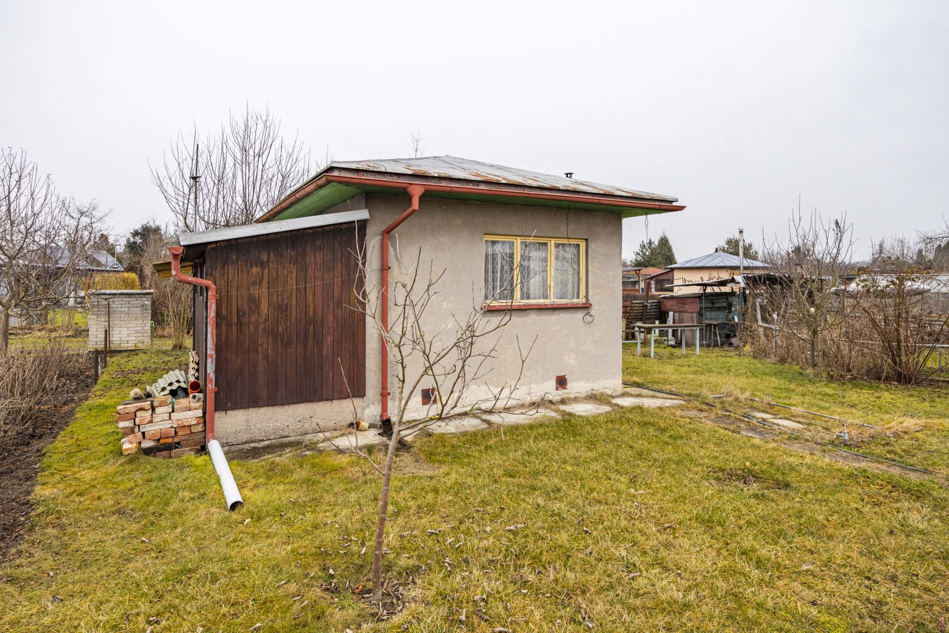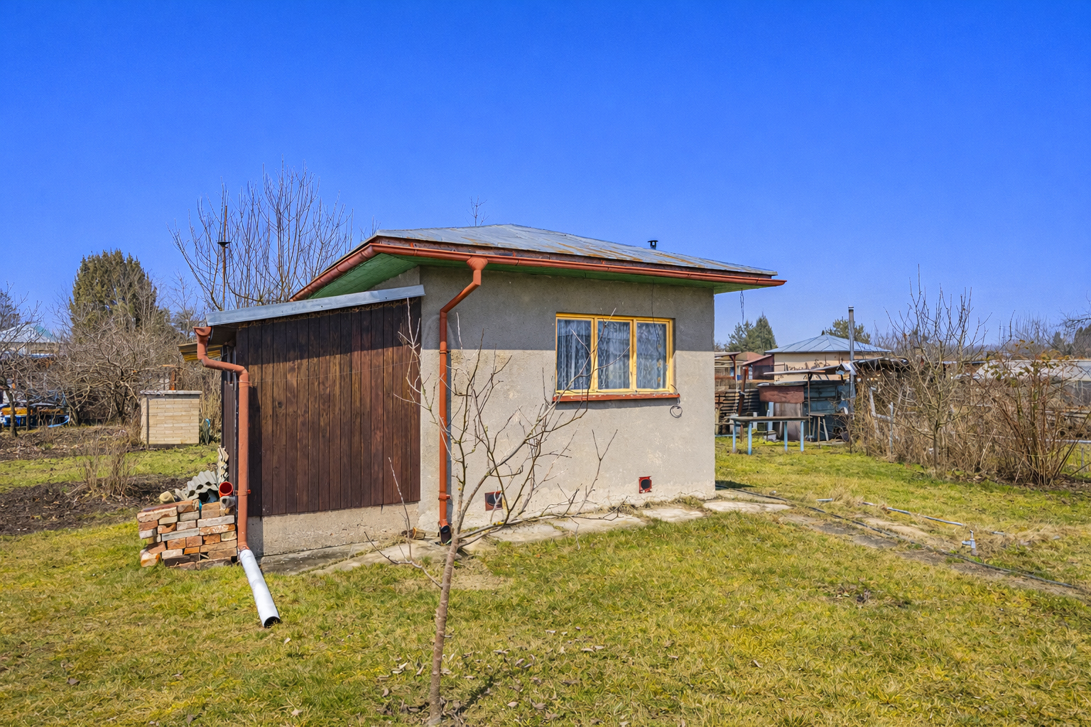 Chata je napojena na elektřinu s vlastními hodinami, což zajišťuje pohodlné užívání. K pozemku o velikosti 576 m² náleží vodovodní přípojka užitkové sezónní vody, což je ideální pro zahradničení a další aktivity spojené s přírodou. Kolonie je zabezpečena vjezdem s elektrickým pohonem a nabízí vlastní parkoviště a společné sociální prostory.